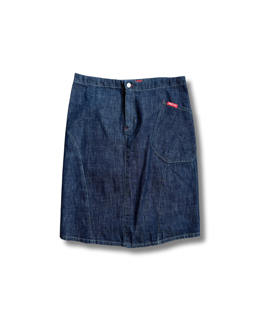 Modèle : Jupe en jean bleu avec surpiqûres blanches contrastantes