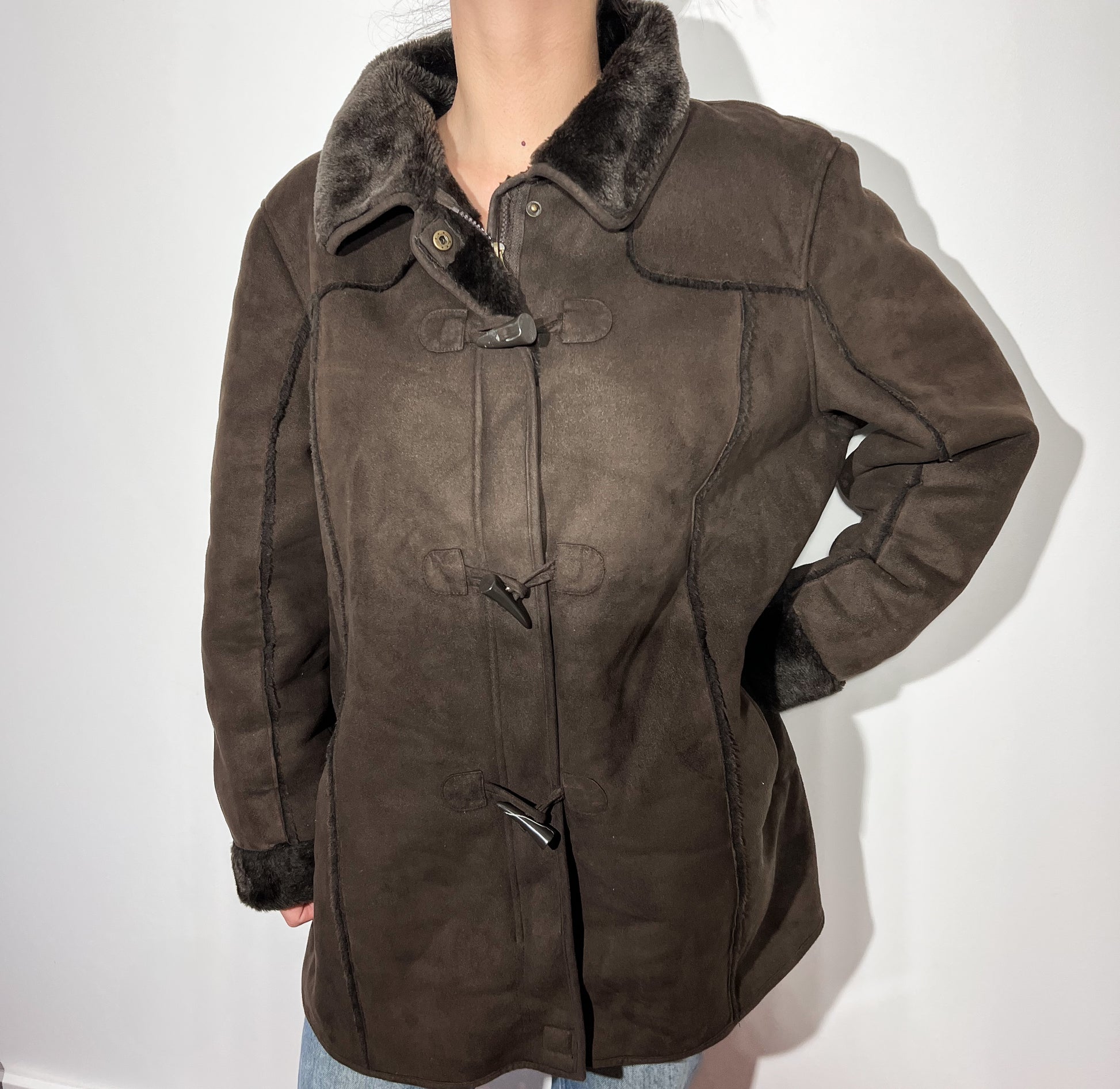 Modèle : Manteau marron vintage en fausse fourrure et daim, coupe mi-longue