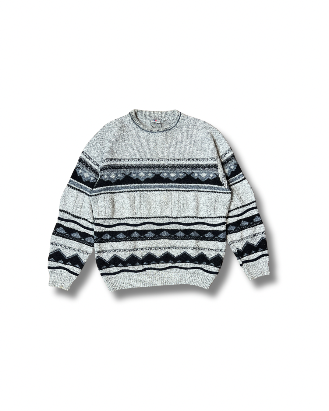 Modèle : Pull de Papi Brice vintage – gris, motifs bleu marine et noir