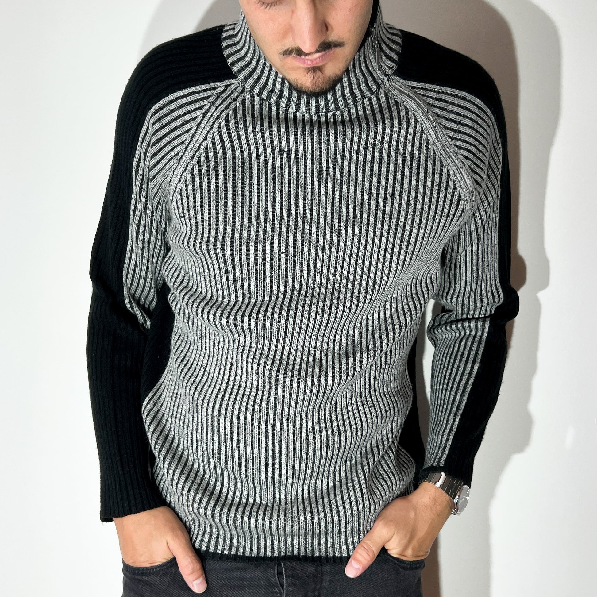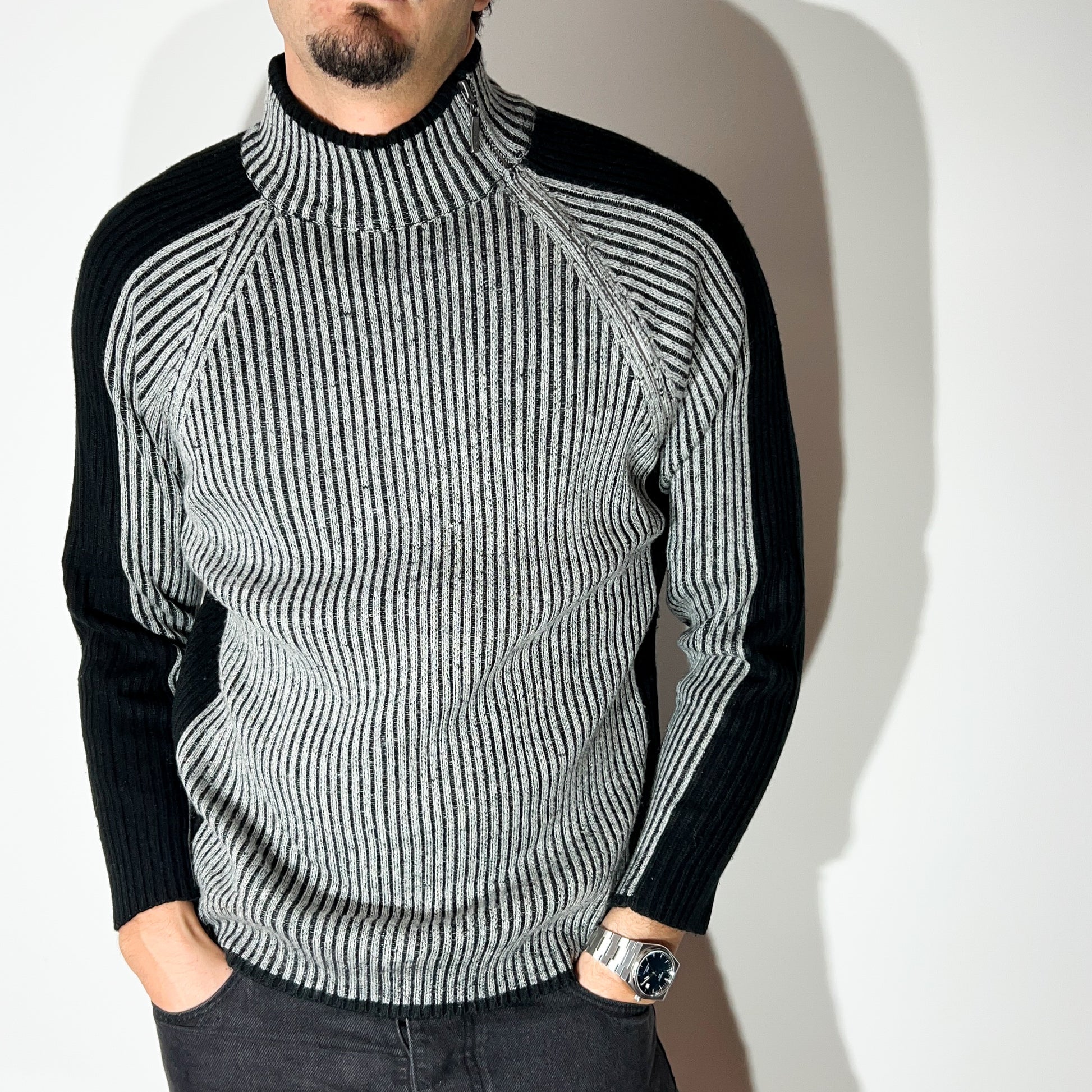 Modèle : Pull côtelé Y2K – gris et noir, fermeture éclair du col jusqu’à la base